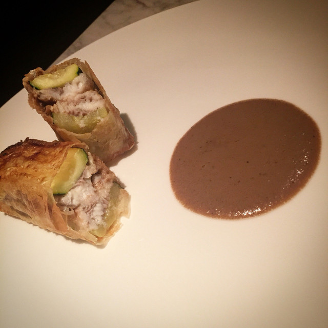 鮎、タマゴと肝のソース、ズッキーニのパートフィロ包み、へベス添え 。前回と似た構成でしたが、悪くなかったです。