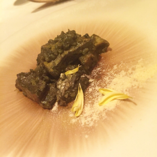鮑とアワビの肝のリゾット( ´ ▽ ` )ノ夏子さんに深く関わる土地からの素材。鮑は超絶柔らかくて、肝の臭みも程よく調整し、旨みに昇華させた素晴らしい前菜。