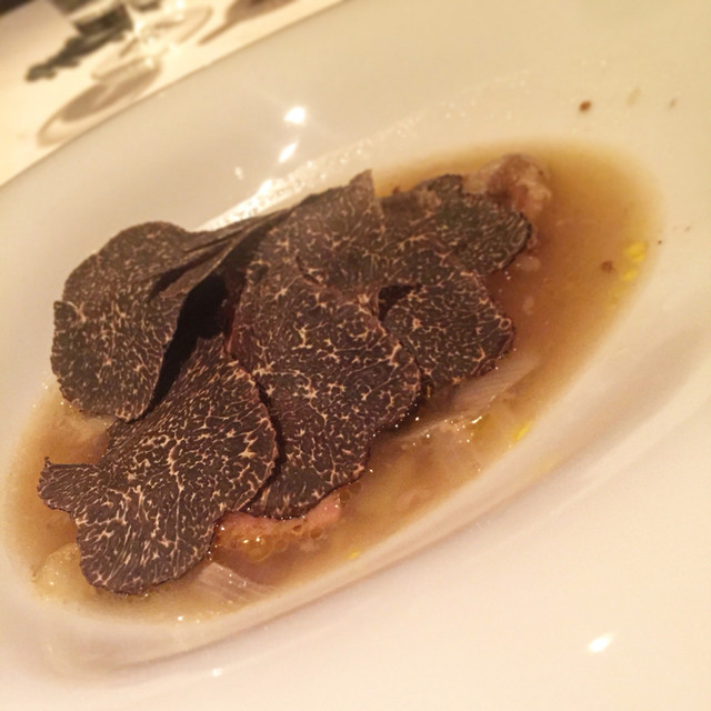 極限まで雑味を抜いたイノシシの脂と極限まで脂抜きされたフォアグラとトリュフのスープ仕立て( ´ ▽ ` )ノ