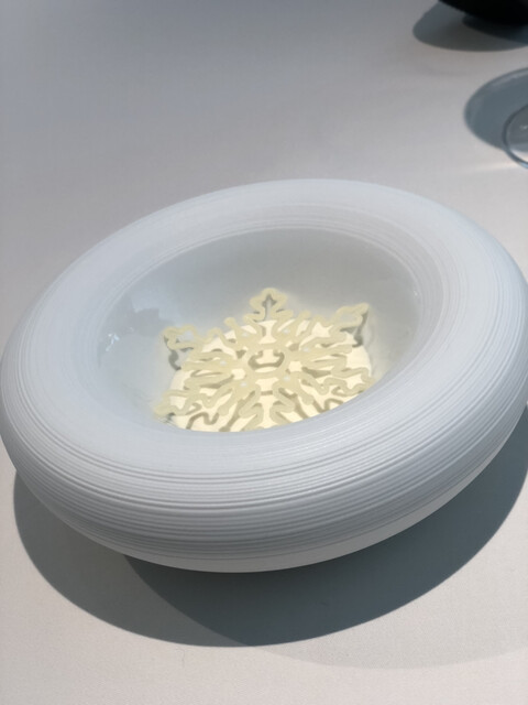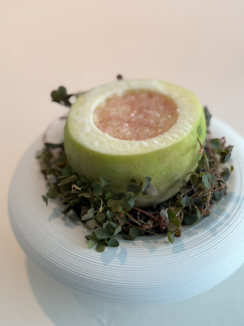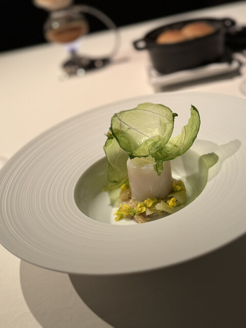 二皿目はシグネチャーディッシュなつや姫と毛蟹の冬バージョン。つや姫はお米の品種の中でも甘味が強い一方、もちもち過ぎず、硬過ぎない品種のため、餅のようにねっとりし過ぎず、硬さゆえのお米感も悪目立ちせず、毛蟹の甘さとのバランス、口に入れた時のテクスチャが心地よい一皿。