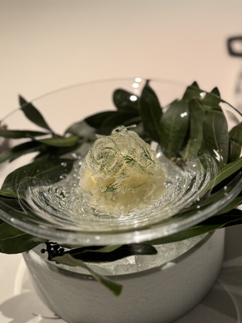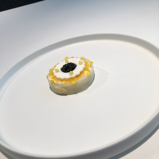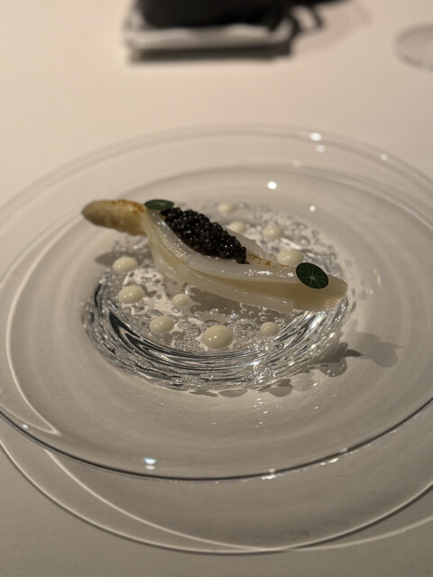四皿目はボタンエビ。こちらも異なる味がコーティングされ、キャビアとフィンガーライムで味の対比が楽しめる楽しい一皿。今回のコースの中で一番シェフがこだわっていたとヒシヒシと伝わってくるおさらでした。