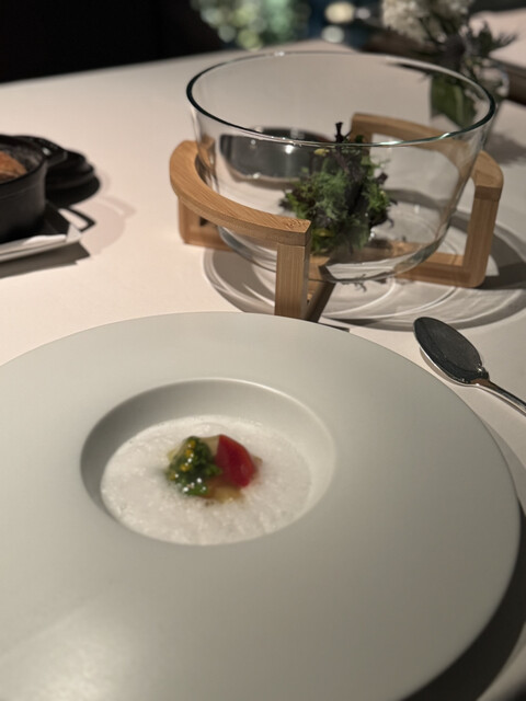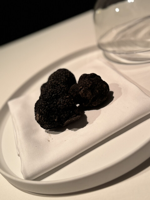 能登の高農園さんが無事だったことをお伺いし、ホッとしたところで、卵ともち麦とトリュフの前菜からスタート。究極の滑らかさともち麦のぷちっとした食感が楽しい一皿目。