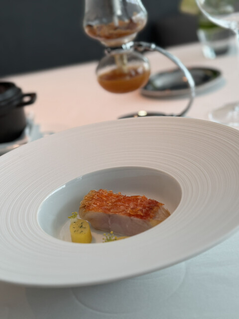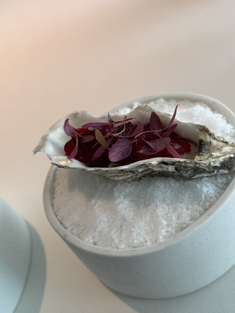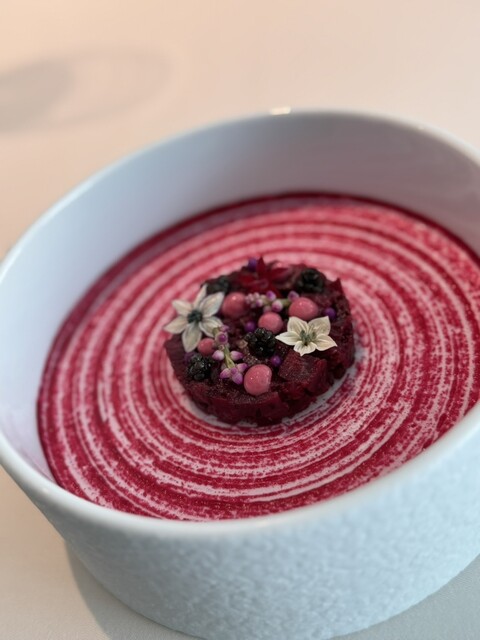 三皿目はファアグラとあまおうとビーツの組み合わせ。雑味を完全に取り除いフォアグラとあまおうの持つ酸味と甘み、ビーツが持つ土臭さと甘みの2種類の異なる甘さがフォアグラ引き立てるようなお皿で、フォアグラが主役というよりビーツやあまおうを引き立たせるような名バイプレイヤーのようなはたらきを感じたおもしろい一皿。