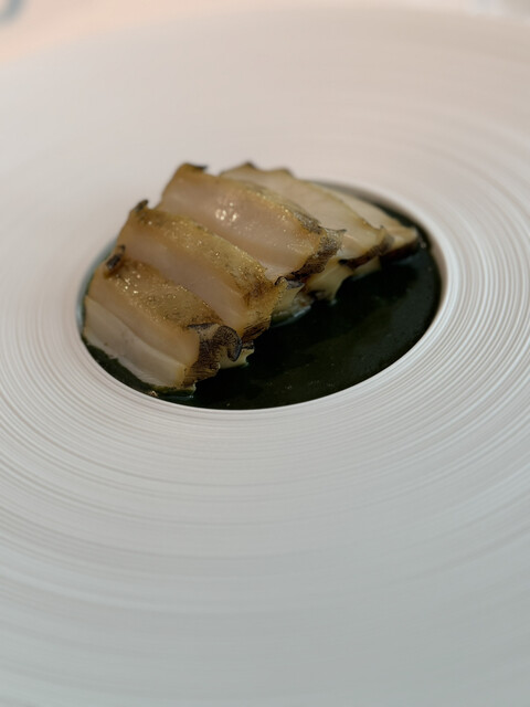 六皿目はクエと山菜のタプナード。山菜をガルニチュールとして出すお店は結構ありますが、こちらはタプナードソースにしたありそうでなかった発想で、大人じゃないとわからない苦味がクエの甘みや食感をより引き立ててくれたお皿でした。