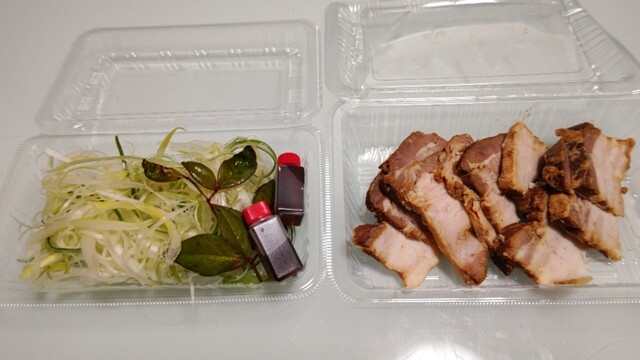 お持ち帰りのチャーシュー♪ネギを乗せてタレをかけて食べます