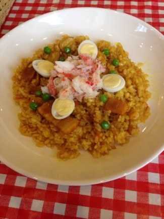 ズワイガニの切り身やうずらの卵が乗った可愛らしい炒めカレーです。
