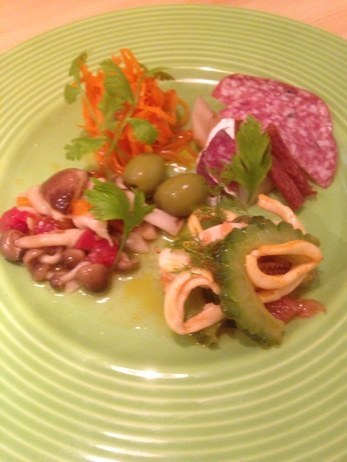 キャロットラべ、キノコのマリネ、サラミ各種、イカとゴーヤとグレープフルーツのマリネ、オリーブの5種類盛り。