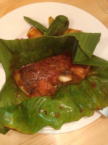 スズキをスパイスで味付けてバナナの葉で包み、さらに焼き上げた南インド料理です。