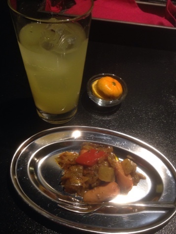 シークワーサーサワー、ソーセージと大根のスパイス和え(お通し)
