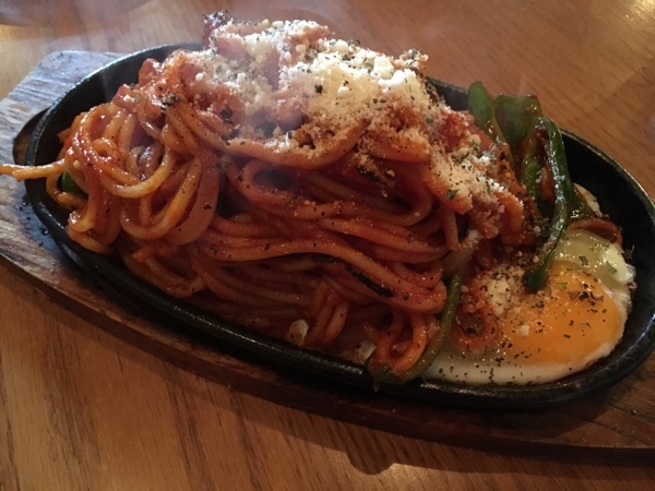 鉄板で供される昔ながらのナポリタン。