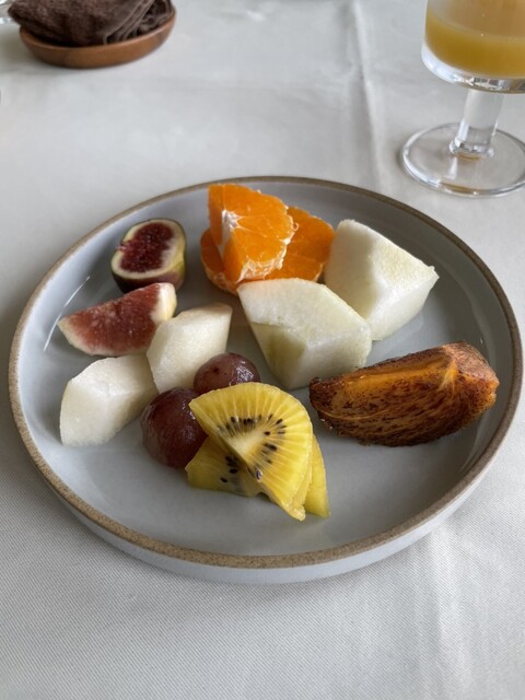 朝ごはんは、フルーツ沢山とモッツァレラチーズ、生ハム、クロワッサンなど。