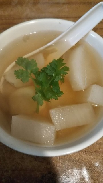 スープは、大根とじゃがいもが大きい塊で入ってました