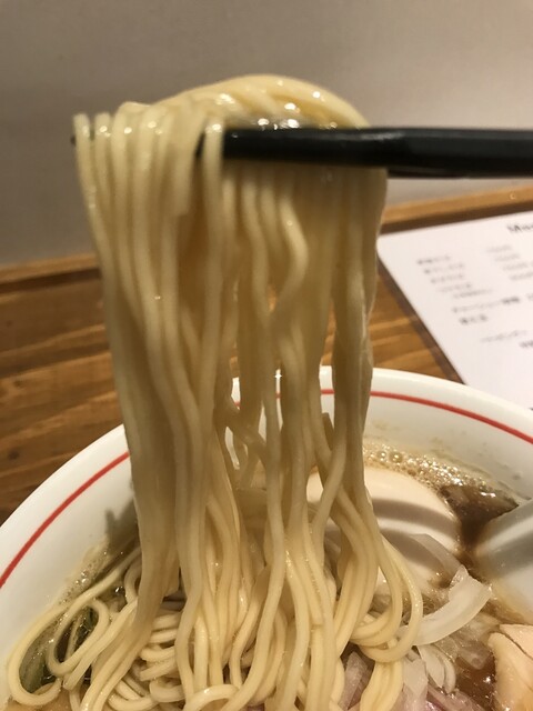 琥珀色のスープに、僅かに煮干し由来と思しき銀粉が浮遊している。