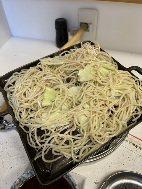 最後は焼きそば。これもまたホルモンの脂が残った鉄板で焼き上げ最後卵を落として出来上がり。