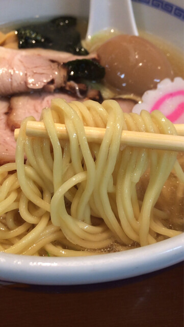 黄色い中太のストレート麺はずっしりとしていて少し濃い色をしたこのスープとの相性も良い