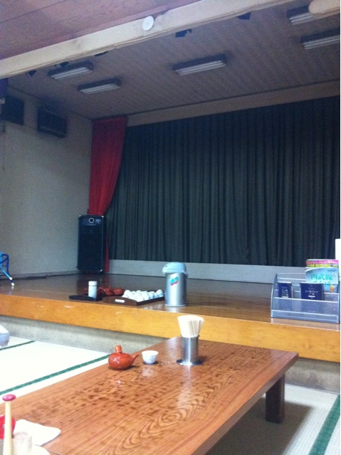 古い公会堂と言うか公民館のような建物の入口に、うどんと書いた暖簾が掛かってるだけの佇まい。中に入ると、正面にこれまた管理人室のような小さな窓口があり、のぞき込むと揚げた天ぷらが並んでます。窓口の上には短冊状の簡単なメニューが貼ってあります。眺めてると係りの女性が来て煙草を吸うか聞かれます。吸わないと告げると右側の部屋にどうぞといわれ、靴を脱いで上がります。まだ11時前ですが、先客が10名ほどいます。左側の部屋は喫煙者用の部屋で、ちゃんと分煙化されてます。続々お客さんが入ってきます。禁煙席の部屋は広く、ステージと言うか舞台まであり、元々は何に使われてた場所なのかなと、余計に謎が深まります。肉汁うどんの並と、タマネギと春菊の天ぷらを注文し待ちます。うどんの本を読みながら待つ事10分程で、本物のうどんの到着です。