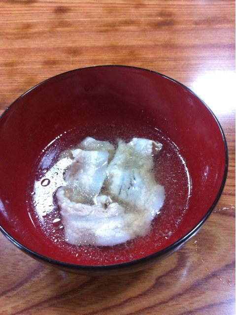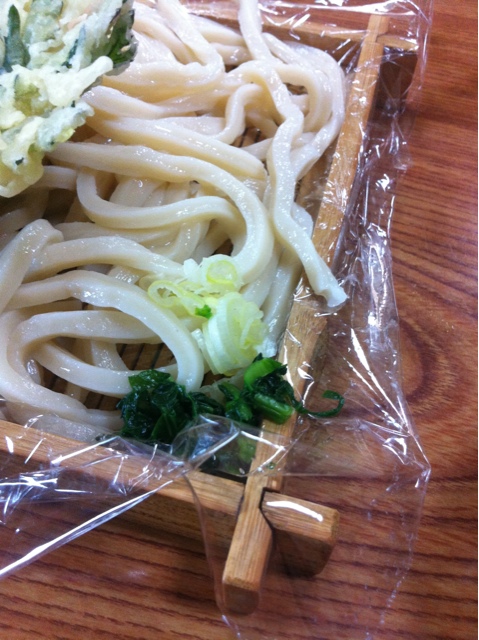 味噌汁のお椀に透明な汁が3割程度、汁の中には薄長い豚バラ肉が一枚。舐めてみると、いりこ出汁でそれに鰹出汁のカエシを割って自分好みに調整して食べるスタイル。うどんは洗い物の手間を考えてか、せいろにラップを敷いて、その上にうどん、天ぷら、薬味も乗っけて出てきます。