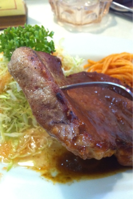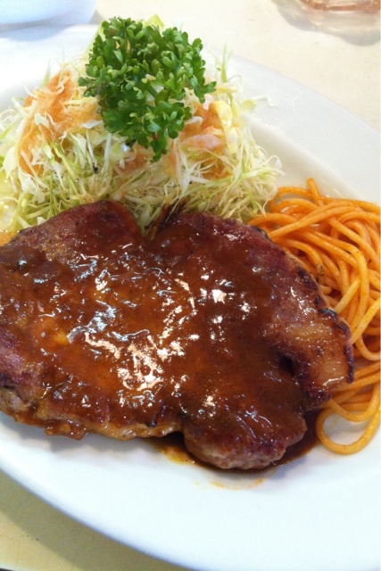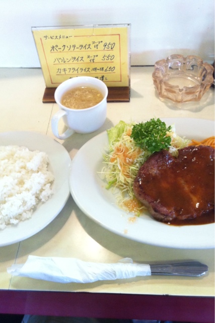 初訪問から2日後のこの日は、13時近くの訪問でしたが先客はやはりなし。チキンカツかオムライス、バルンライス、ハンバーグとかなり悩んだ末、こちらでは1番高価なポークソテー(950円)を注文する事に。時間にして約7分ほどで出てきたポークソテーはかなりの厚みで、2cm近くはある厚切りのロース肉。まるでハンバーグのようです。お肉も柔らかく味付けも老舗の洋食屋さんらしい無難で食べ慣れた味。ライスと良く合うのだが、ライスの盛りは少なめなので男性は大盛りでないと少し物足りないかもしれません。