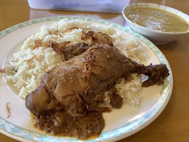 茶色いカレーの色に染まったご飯には、チキンの出汁とスパイスが染みこんでいて。