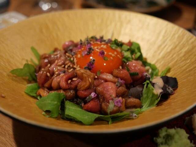 最初は軽快で透明感のある一杯から始まり、鴨たたきや馬刺しには旨みの厚い純米酒、仔牛ユッケには酸と輪郭のあるタイプを合わせるなど、流れが実に美しい。