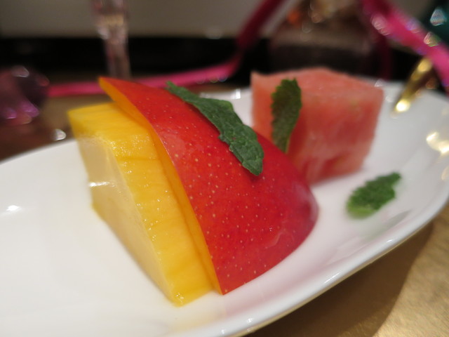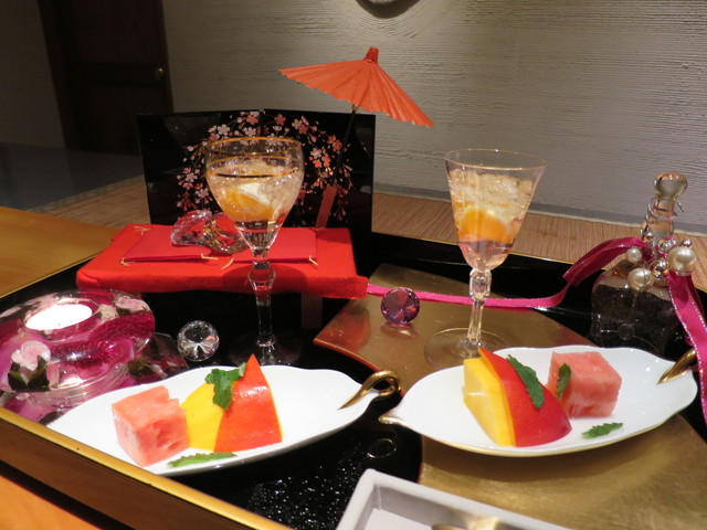 宮崎産マンゴーと小玉すいかの盛合せに、清美タンゴールの桜リキュールと