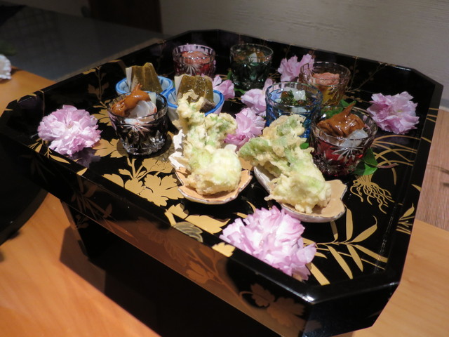 フキノトウと一寸豆の天婦羅、煮鮑の肝ソース掛け、鯛の白子の寒天の鯛の酒盗掛け、