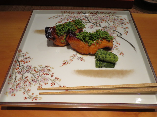 海鱒の照焼、花山椒とガーキンの和風ピクルス添えです。