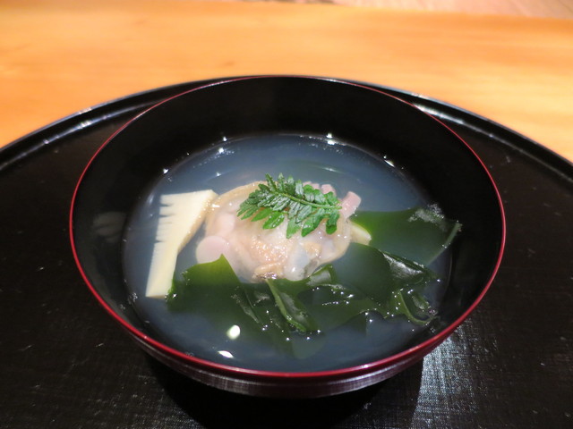 蛤のお椀です。筍とわかめ、木の芽が添えられます。