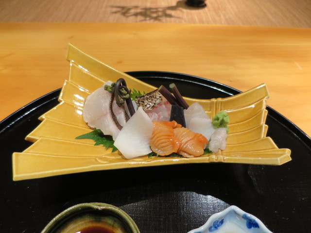 アイナメ焼霜造り、鯛、鯛の皮の炙り、マコガレイ、マコガレイのエンガワ、赤貝。