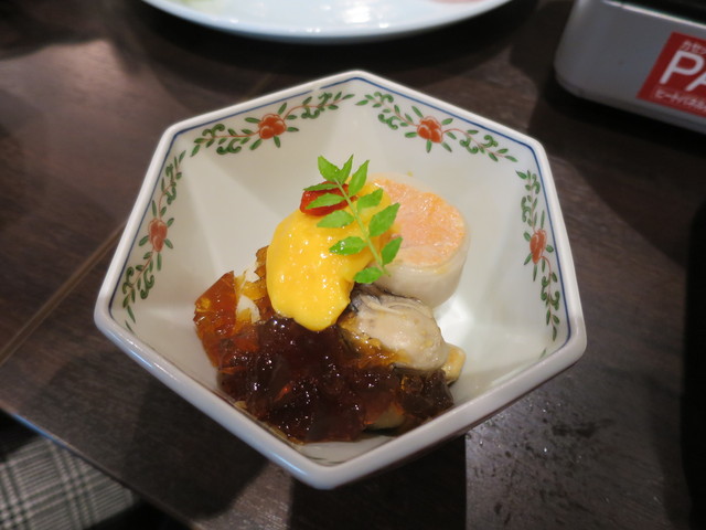 あん肝を大根で巻いたものと牡蠣のポン酢ジュレと黄身酢がけです。