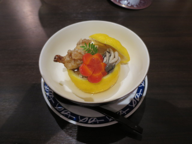アンコウの唐揚げと海老真薯の柚子釜です。