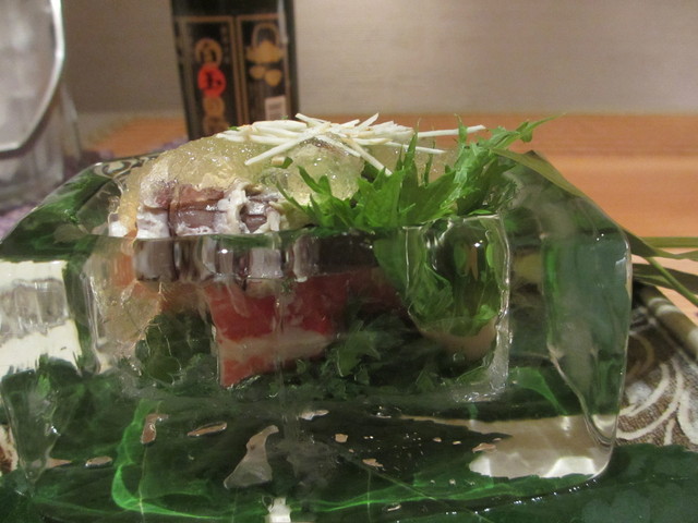 毛蟹、シャコ、つぶ貝のジュレ掛け