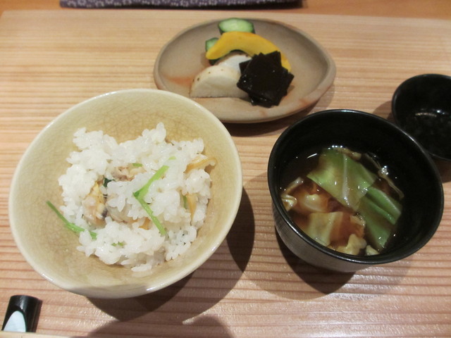 あさりご飯、漬物、生キャベツの赤だし