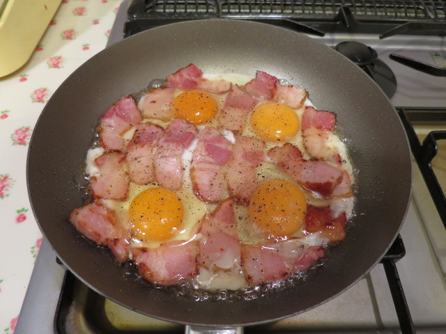 ベーコンエッグ調理中