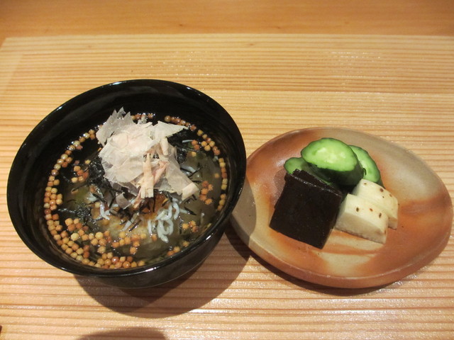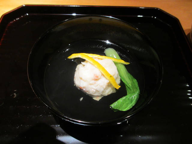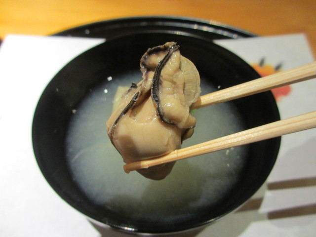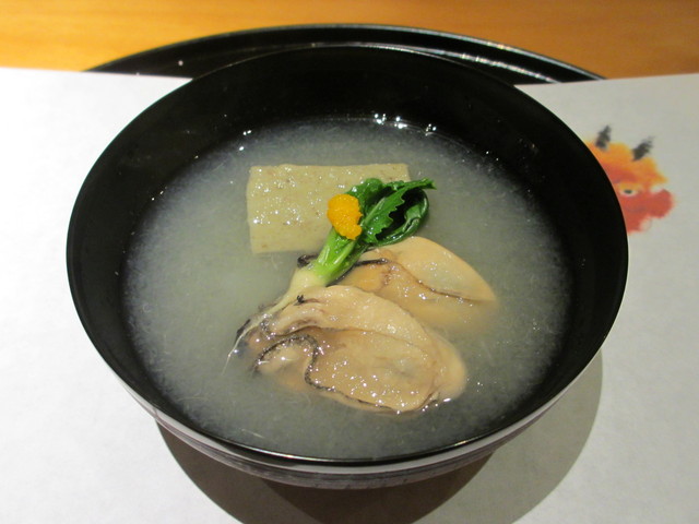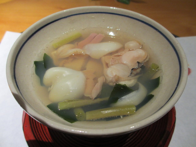 ハマグリ、わかめ、花わさび、百合根の汁物