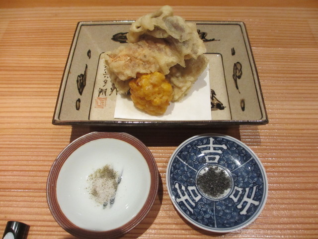 雲子の湯葉揚げ、ヨモギとあん肝の海老いも揚げ