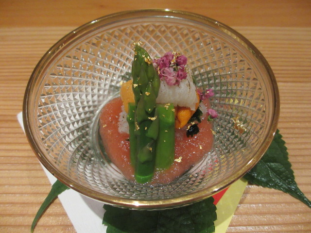 焼霜の鱧、雲丹、アオサ海苔、アスパラガス