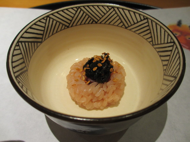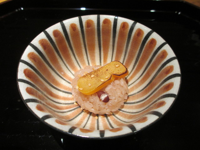 赤飯に炙りカラスミを乗せて