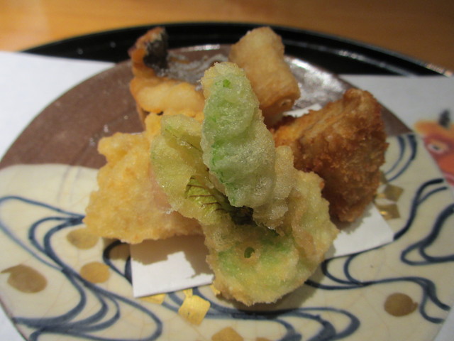 太刀魚の唐揚、車麩コロッケ、つぼみ菜と平貝の天麩羅
