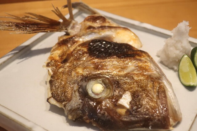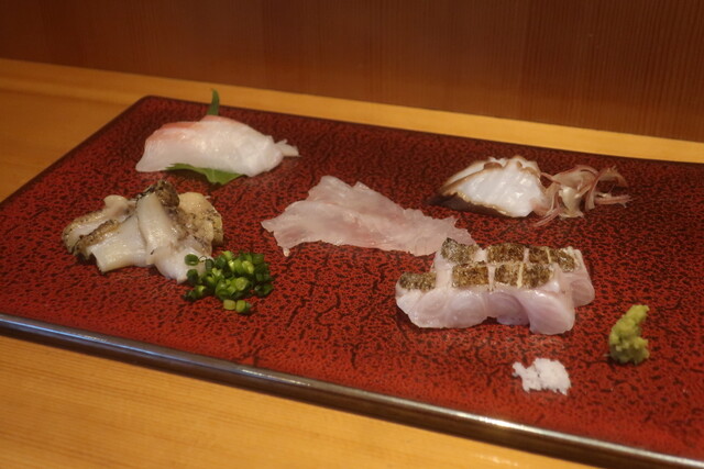 この日の内容は、カンパチ、ウスバハギ肝添え、太刀魚炙り、真鯛炙り、メイチ鯛。