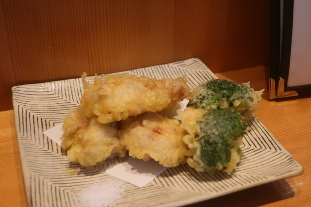 そして別皿には鶏ももと紫芋の天麩羅。塩を添えて。