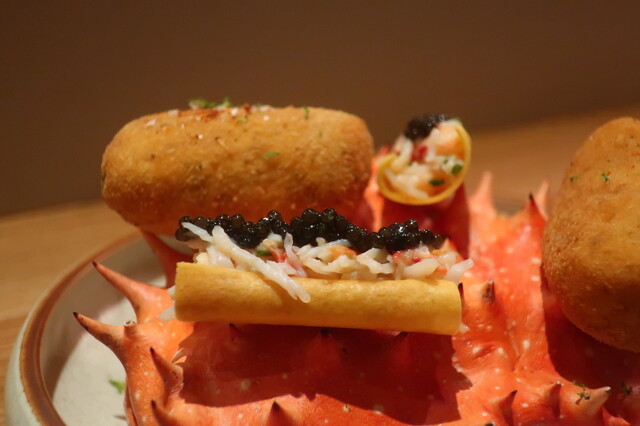 ズワイガニの身をカリフラワームースでサンドし、ズワイガニのゼリー、