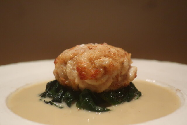 マナガツオのフリット、焦がしバターでソテーしたほうれん草、花ニラを添え、