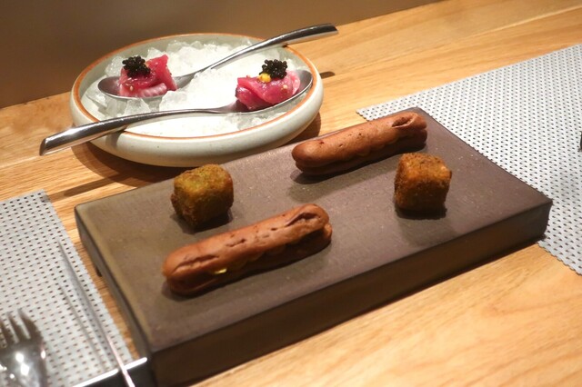 薄焼きの球状の生地(プリ)に、焼き茄子クリーム、鰯、トマト、キャビア。