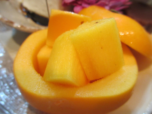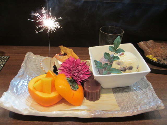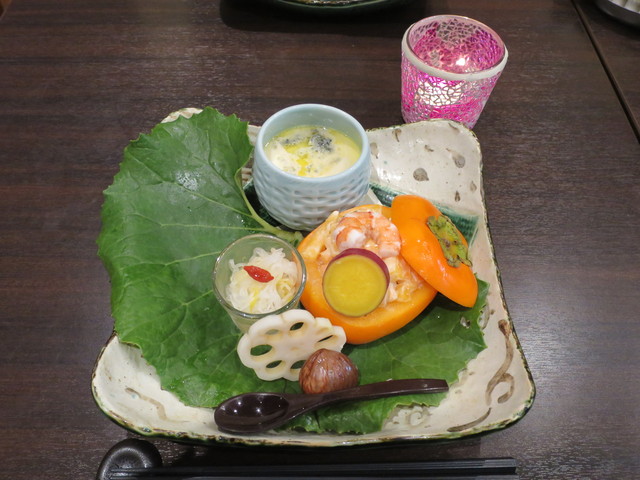豆乳ぜんざい、柿、芋のムースの盛合せです。とても400円とは思えん!