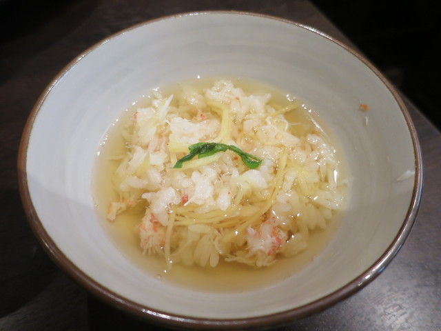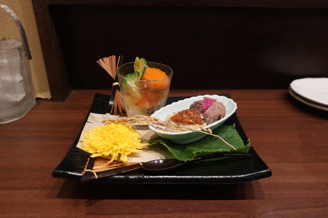 お通しの柚子なます、人参のすりながし、ブルーチーズの茶碗蒸し