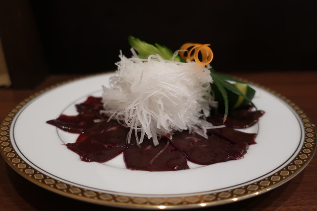 極薄切りにされた馬のレバ刺しに、薬味として紅芯大根と生姜の千切りが添えられます。