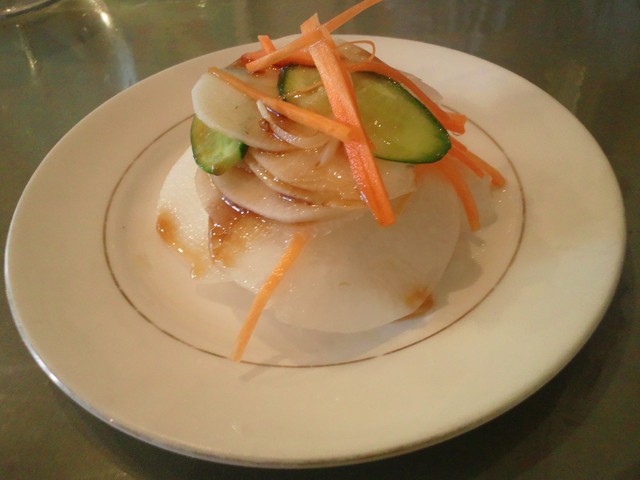 カレーの皿には、タマネギのアチャールがそっと盛られており、これが独特の味付けで美味でした。 野菜やチキンは大きめのものがごろんと入っています。 今日は、オクラが入っていてすごく美味しかったです。 あと、セットの「大根ときゅうりのサラダ」は、特製のドレッシングをかけて食べます。 かなりシンプルでありながら、ししとうを漬けこんだピリ辛のドレシングがとてもよく合います。