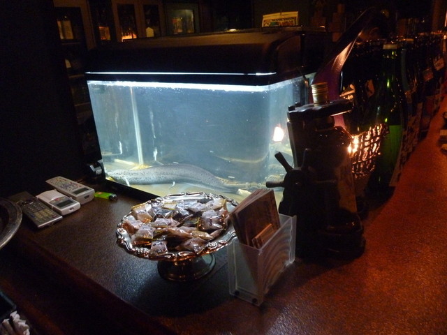 何気に飲んでいると、マスターがその日にとってきた海鮮類がお通しになります。 今日は、なまずでした(笑)
