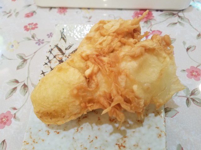 これも、おそらくは近くで採ってきた山菜なのでしょうけど、全体としてはオマケ程度にも見える何気ない山菜の天ぷらがめっちゃ美味しかったな~、ほんのりとした渋みにサクッとした食感、なんだかここの民宿に泊まってビールの肴にしたいくらいの具でした。